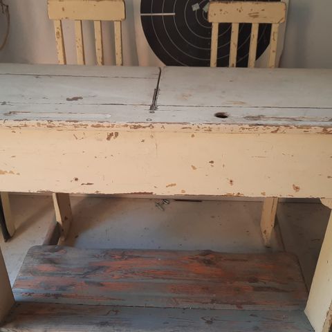 Vanha kahden istuttava pulpetti. Ensimmäisen kuvan väri lähinnä oikeaa väriä.
