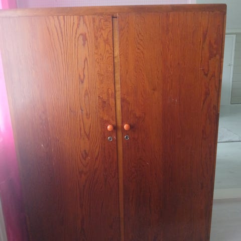 Kunnostusta, entisöintiä vaativa, noin sata vuotta vanha liinavaatekaappi. Korkeus 173 cm, leveys 78 cm, syvyys 44 cm.
