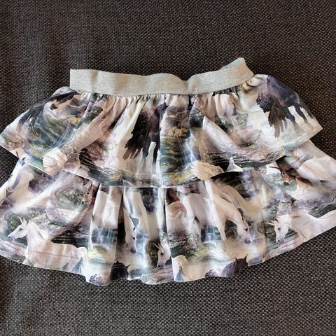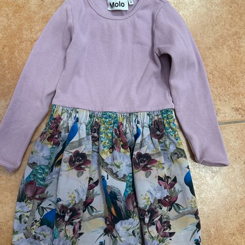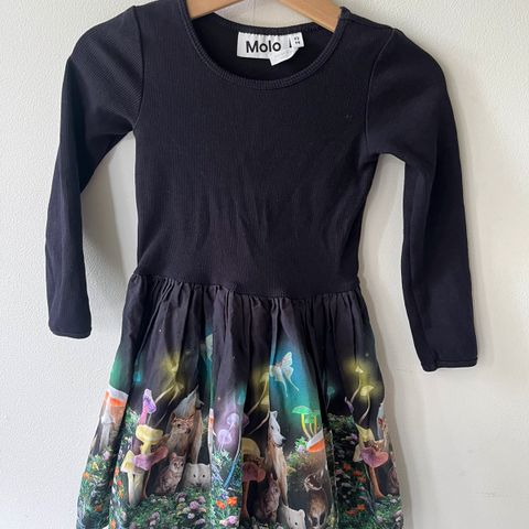 Molo 92/98 mekko, hame hiiri/pupu/niitty kuviolla. Vyötäröllä kuminauhanappisäätö. Kunnossa ei huomautettavaa.