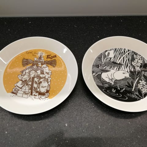 Tarjolla kuvien kaksi Arabian muumilautasta vuodelta 2014: Muumipeikko unelmoi ja Fazer -joululautanen. Lautasten koko 19 cm.