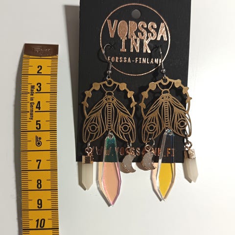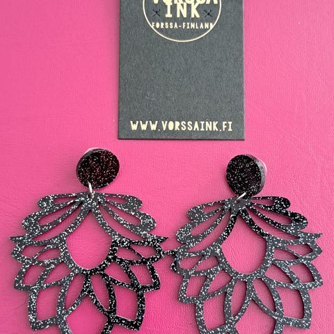 Vorssa Ink Kuunsade Glitteri korvakorut. Materiaali akryyli, koukut kirurginteräs. Koko: 11 x 5 cm. Väri Metsän vihreä. Käyttämättömät.