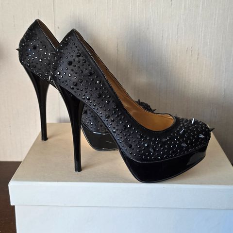 Kengät ovat omassa laatikossaan, jossa niitä on säilytetty koko ajan. Mukana on vaihtopalat korkoihin.