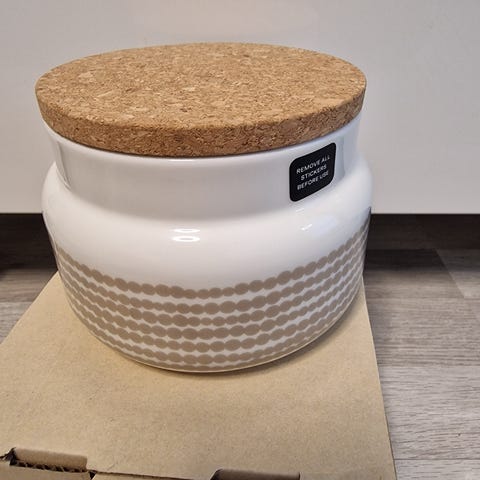 Marimekko pieni purkki . Käytetty mutta hyvässä kunnossa vain kansi sisäpuolelta pieni kolho.Kuva on .