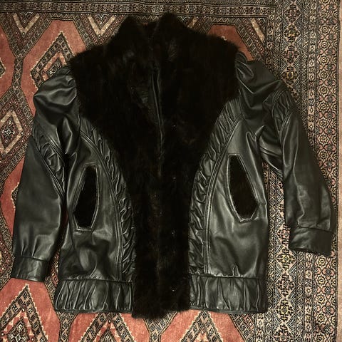 Mokkanapan nahkatakki, irroitettavassa hupussa oleva turkis on kettua.