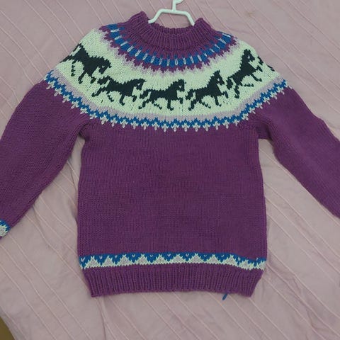 Tummansininen, itsetehty hevosneule lapselle. Koko n. 140 cm. Kainalosta kainaloon 49 cm ja paidan pituus 59 cm. Materiaali on tod.näk. puuvillaa/villaa.