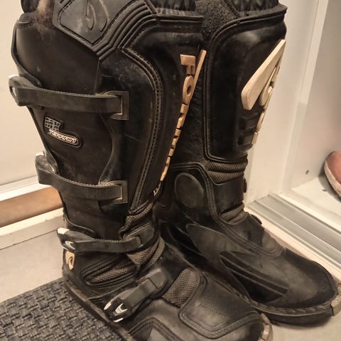 Siistit vähän käytetyt crossisaappaat myynnissä. Yksi soljen klipsi mennyt poikki, ei haittaa kiinnitystä. Koko 30.