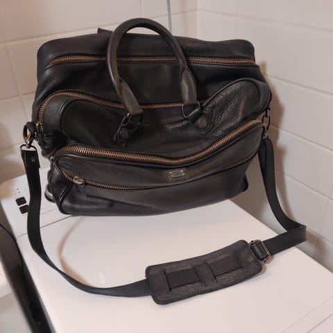 Uusi ja käyttämätön tummanruskea nahkainen olkalaukku, unisex malli.