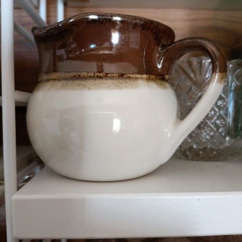 Myytävänä uudenveroinen Kermansaven muki ja lautanen setti.