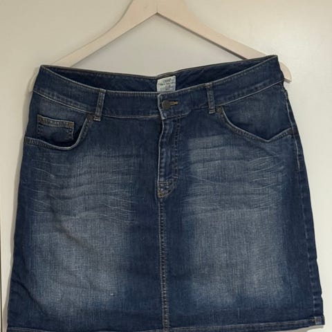 Farkkuhame, joka on vähän käytetty, ehjä ja puhdas. Se on 100 % puuvillaa. Vyötärömitta on n. 84 cm ja pituus vyötäröstä helmaan n. 66 cm. Alimmasta kuvasta näkyy, että vetoketju on piilotettu kankaan alle. Sisäpuolella on nappi, joka takaa, että hame pysyy päällä. Hameen voi hakea tai voi lähettää.