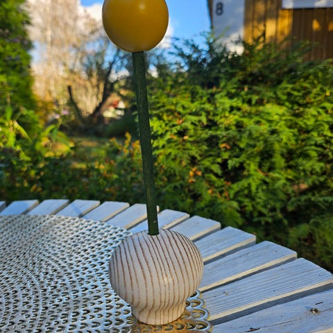 Aarikka pitkä puukukka, pituus 35 cm. Kukka on uusi, mutta varressa on pieni säilytyksessä tullut nirhauma, kts. kuvat. Lähetyskulut pakettina 6 eur.