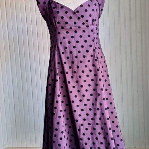 Kaunis satiinipintainen pallokuvioinen mekko 50-luvun tyyliin, alushameessa tylliä. Koko 10, arviolta n. 36-38. Ostin Tallinnan kirpparilta tuunaukseen (koko liian pieni itselleni), mutta eipä tullut koskaan käytettyä mihinkään jonka vuoksi myyntiin.