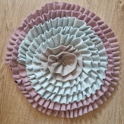 Itse ommeltu koirien namimatto. Leveys 27cm, pituus 39cm ja liukueste pohjassa. Matto on tehty täysin fleece jämäpalojen jämäpaloja käyttäen jotka muuten olisi mennyt roskiin! Profiilissani myös muita tekemiäni töitä:)