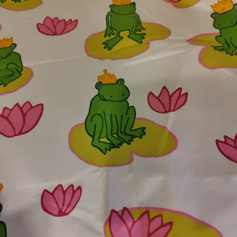 Itse virkattu sammakko panta. Pituus 85cm, mutta narut venyy paljon, leveys 12cm. Profiilissani myös muita tekemiäni töitä:)