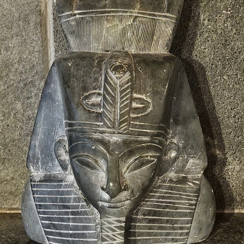 Musta faaraoveistos Egyptistä. Kovaa ja painavaa kivimäistä materiaalia. Korkeus noin 10 cm. Kunto uutta vastaava.