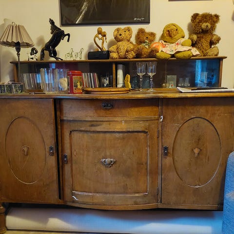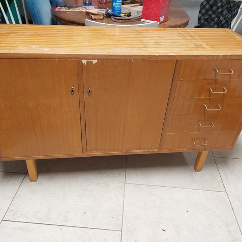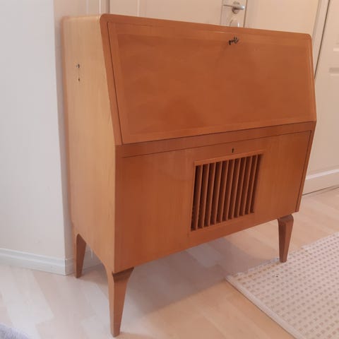 Kuvien mukainen vanha 1950-luvun funkis senkki, jonka sisällä Cosmos -merkkinen levysoitin ns. savikiekoille. Levysoittimen kunto on testaamatta. Itse senkki on kohtuullisessa kunnossa, vaatii hieman kunnostamista. Mitat noin 76 x 40 cm, korkeus noin 66 cm. Hinta 150 euroa. Vain nouto Kuopion Inkilänmäellä mahdollinen. Harvinaisuus. MMM