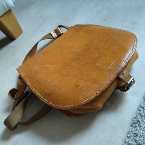 Laukku paksua nahkaa 70-luvulta. Molemmin puolin identtinen,ei sisätaskuja tai vuoria. Korkeus 24 cm,leveys 17 cm, hihnan pituus 71 cm.
