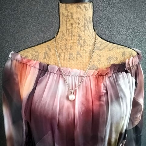 Kiinassa räätälillä noin vuonna 2007 teetetty juhlamekko, aitoa silkkiä. Kangas ostettu Kiinasta. Mekkoa käytetty noin 3 kertaa