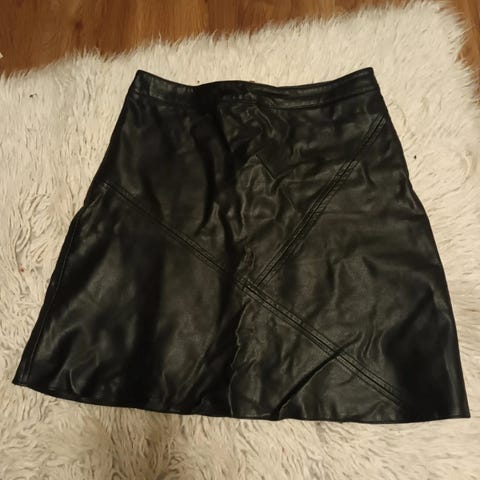 Kaunis, virheetön, uuden veroinen keinonahkahame H&M Divided. Korkeus takaa vyötäröltä helmaan 37 cm. Vyötärö n 72-74 cm. Materiaali ihanan pehmeä.