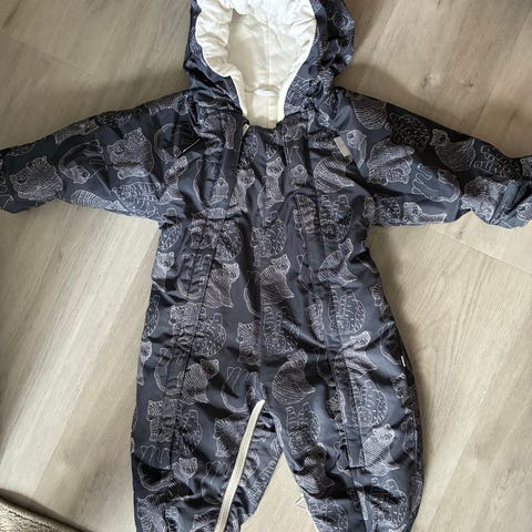 Reiman tummanharmaa toppahaalari karhu-kuosilla. Molemmilla puolilla vetoketjut, jotka helpottavat pukemista. Myös haarassa vetoketjut. Neppareilla saa suljettua lahkeet. Ja kääntöhihat.