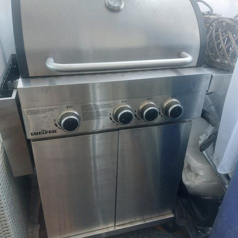 Koko 66 x 35 x 17 cm. Mukana myös letku ja venttiili kaasupulloon.