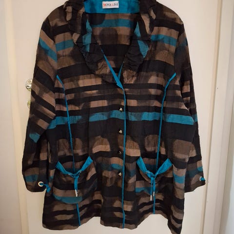 Kangas siftaa hukan läpi osan sopivasti mustan kohdalla. Kevyt ja ryhtinsä pitävä jakku. Ei nappeja, kaunis kaartuva reuna pääntiestä kohti helmaa.