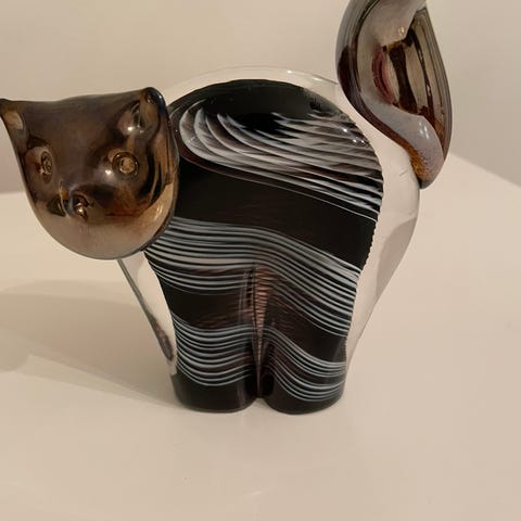 Valkoinen lasinen kissa ja kissanpennut. Korkeus 13cm, leveys 12cm. Erinomainen kunto. Nouto.