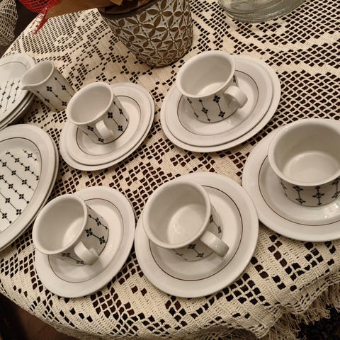 Hyvässä kunnossa. Lasitteesta tavanomaista kulumaa ja toisen kupin korvassa pieni pala lasitetta lähtenyt.