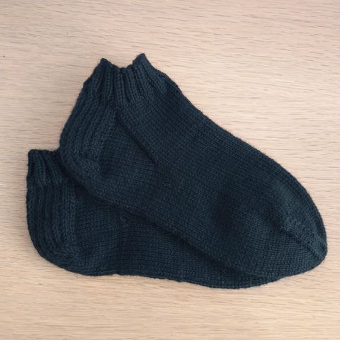 Nilkkapituiset/varrettomat tummansiniset villasukat. Lanka 70% villaa ja 30% polyamidia. Terän pituus n. 27cm.