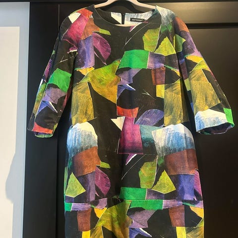 Upean näköinen mutta käyttämättä jäänyt Marimekon mekko. Joustavaa paksua (samettimaista) puuvillaa, alla vuori, selässä vetoketju. Mekon malli timantti, istuu kauniisti päälle.