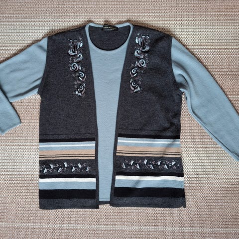 Kokomerkintä M, mutta vastaa jopa XL-kokoa. Hartian leveys 65 cm, pituus olalta helmaan 68 cm.