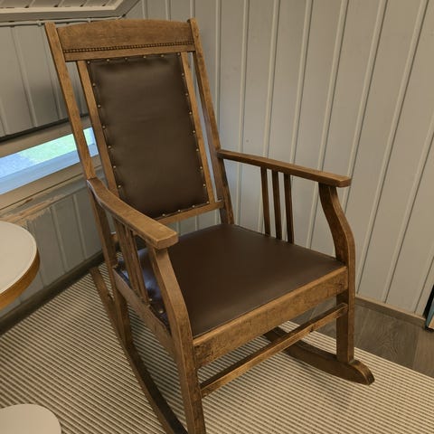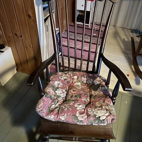 Vanha mutta toimiva keinutuoli. Metallivaijerin varassa joten ei pääse kaatumaan eikä ole teräviä jalaksia. Ainut miinus takaosan kankaan osittainen irtoaminen. Tarjoa.