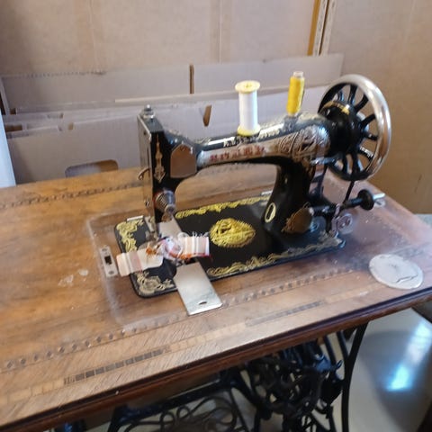 Vanha mekaaninen ompelukone puukannella