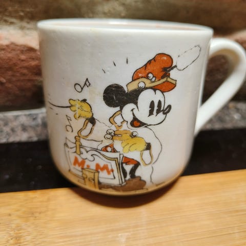 Myydään tarjouksen perusteella 1950-luvun Mikki muki. Kuvassa näkyy vika.