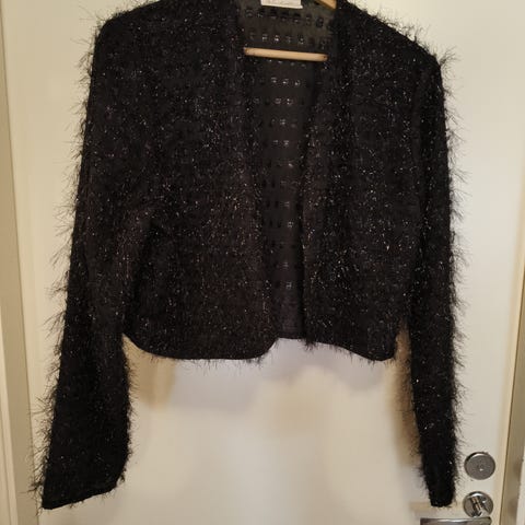 Himmeähohtoinen musta jakku rusehtavilla raidoilla. Vetoketju edessä.