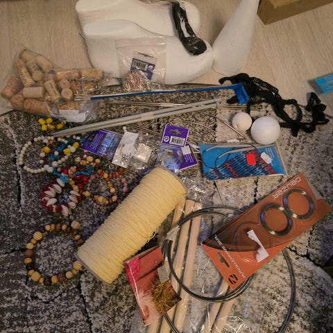Askartelutarvike paketissa on mm puuvilla nauhoja, helmiä, nahka ja muovinauhaa, pieniä kangaspaloja, nappeja, metallilankaa, metalliketjua, pussukan mekanismi.