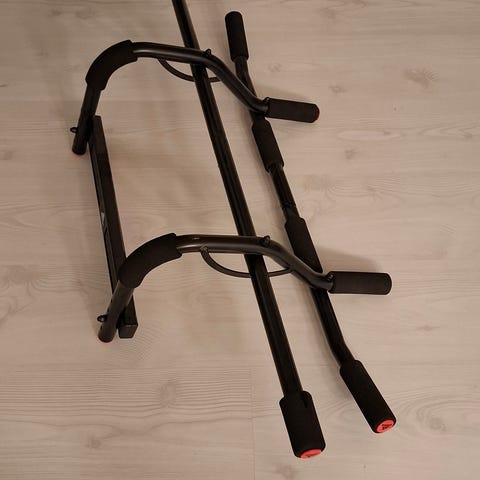 Kuntotanko. Oven karmien väliin kiristettävä. Karmiväli 62x90 cm. Esim roikkumiseen, selän oikaisuun, leuanvetoon. Paino noin 2kg.