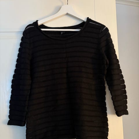 Musta, ribattu ja edestä avoin paita. Vähän lyhyempi malli. Koko M, menee väljänä myös S-koolle. Joustava.
