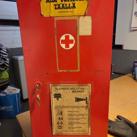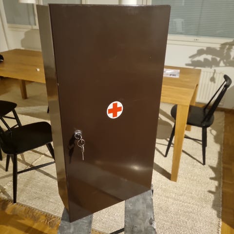 Peltilääkekaappi Avaimella ja kaikki ehjää myydään parhaalle tarjoukselle Vanha kiva teksti ovessa sisäpuolella Olisikohan kaappi 1950-luvulta