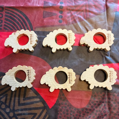 8 kpl puiset Aarikka lautasliina/ Servietti "Lammas" renkaat. Vain kaikki 8 kpl yhdessä yhteishintaan. Stailauskäytössä olleet, puuosat hieman eri väriset. Ei toridiiliä, en tingi. Nouto tarkka aika etukäteen sovitusti ma-pe kl.10-16 hki88 tai postitse pakettina.
