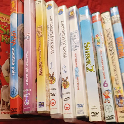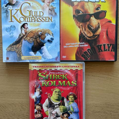 Kuvan mukaiset dvd.t. 1,50/kpl. Shrek viimeinen luku ja Bolt blurayt 4e/kpl.