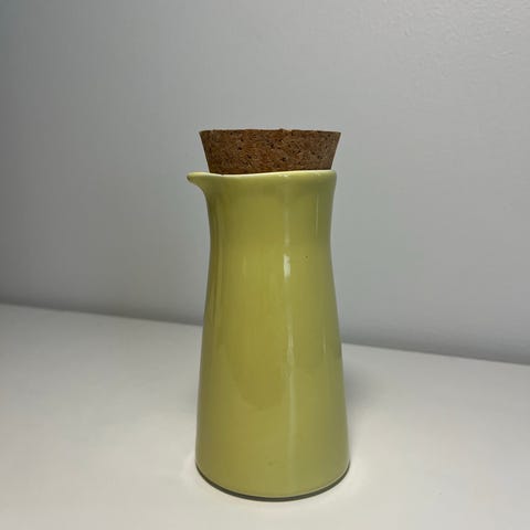 Vihreä piippuleima ja teksti "Suomi Finlandia". Täysin ehjä eli ei mitään halkeamia tms., mutta kultaus on kulunut (varmaankin piiitkän varastoinnin myötä), mikä näkyy astian reunassa. Kokoa noin p 12.5cm x k 7.5cm.