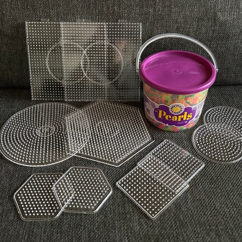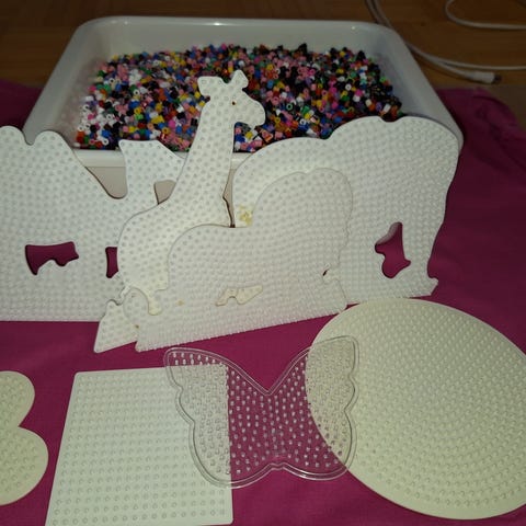 Hamahelmialustoja: pingviini, nalle, elefantti ja kirahvi ja ohjekuvia. Käytössä olleet, kunto hyvä.