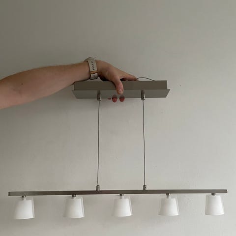 Ihana kattovalaisin lasipalloilla. Valaisimessa musta kangasjohto, jonka pituus palloista kattoon on n.250 cm sekä valkoinen kattokupu. Valaisimen korkeus polttimon kanssa 43 cm. Led-polttimon saa kaupan päälle. Ollut jonkun aikaa käytössä, ei enää tarvetta uudessa asunnossa. Kangaskassi tulee mukaan. Kaksi lasipalloa hajonnut, niitä saa uusia tilattua. Voi käyttää ilman niitäkin.