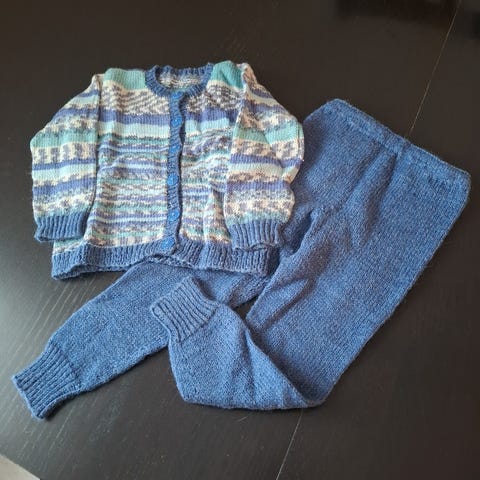 Itse tehty, joko nalle langasta tai 7 veljestä langasta. Tästä on niin paljon aikaa, että ei pysty muistamaaan. Poolokaulus on tehty langasta, joka ei kutita kuten usein villasekoite voi. Joten on mukava käyttää.