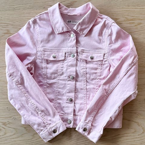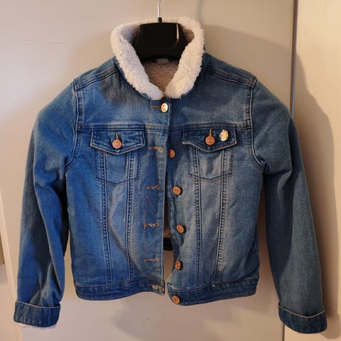 Farkkutakki jonka rinnassa on kukkakuviointia ja hapsu hihansuut ja helma. Täysin ehjä, erittäin siisti.