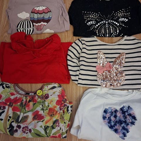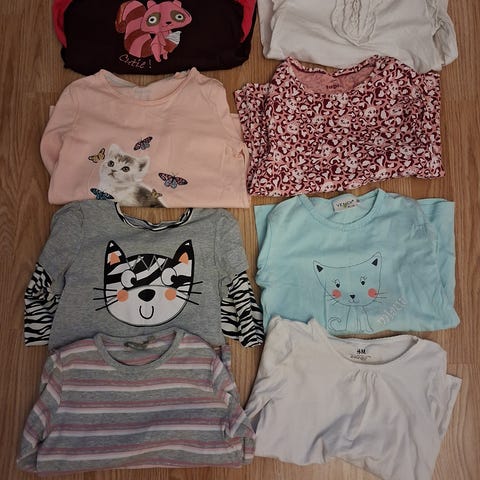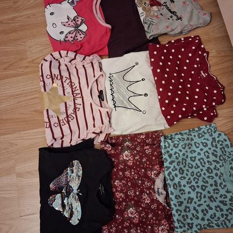 Sininen pitkähihainen paita koko 122 ja lumihiutale 122/128, mutta ottaisin käyttöön koossa 116, muut kokoa 116.