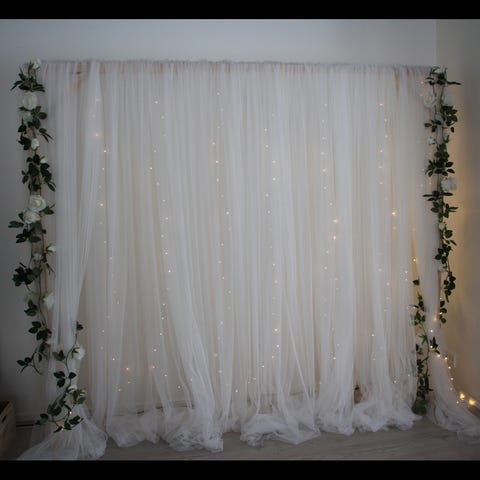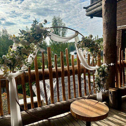 Jalkoihin isä teki lankunpaloista tuet (näkyy kuvassa luonnonvalkoiset), jotta pysyy tukevammin pystyssä. Hääkaari menee 3 osaan eli mahtuu hyvin normaaliin henkilöautoon tai varastoon säilöön.