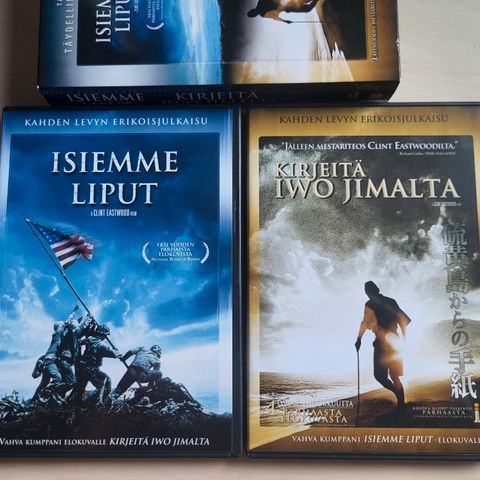 Huippuluokan sotaleffa toisen maailmansodan Iwo Jiman taistelusta kahden DVD:n julkaisuna (katso kannen kuvaus alta). Suomijulkaisu, tekstit suomi, ruotsi, norja, tanska ja italia. Puhe valittavissa englanniksi (alkuperäinen), mutta myös italiaksi. Kunto erinomainen (tori-luokittelussa voisi siksi olla myös kuin uusi). Hieno lahjaidea! Hinta vain 4 euroa, edullinen. Kiva lahjaidea! TORIDIILI: Voit ottaa yhdellä ostolla, yhdessä paketissa ja vain yksillä Toridiilin maksuilla useamman DVDn, KYSY ENNEN OSTOA jos haluat useamman. Saat muut DVD:t ja Blu Rayt näkyviin hakusanalla ollin dvdt. ILMAN TORIDIILIÄ POSTITUS ilman muita kuluja Helposti-kuoressa 3,50, kysy ENNEN OSTOA, jos haluat sen.