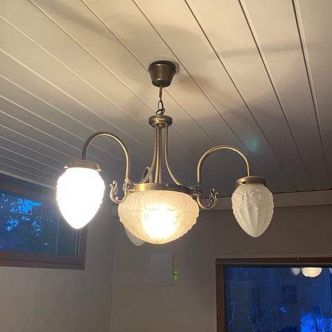 Hieno jugend tyylinen valaisin. Halkaisija 26cm korkeus 65.