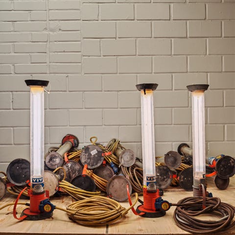 Lampuissa on pohjassa vahva magneetti jolla sen saa kiinni metallipintaan, yhdestä se uupuu.